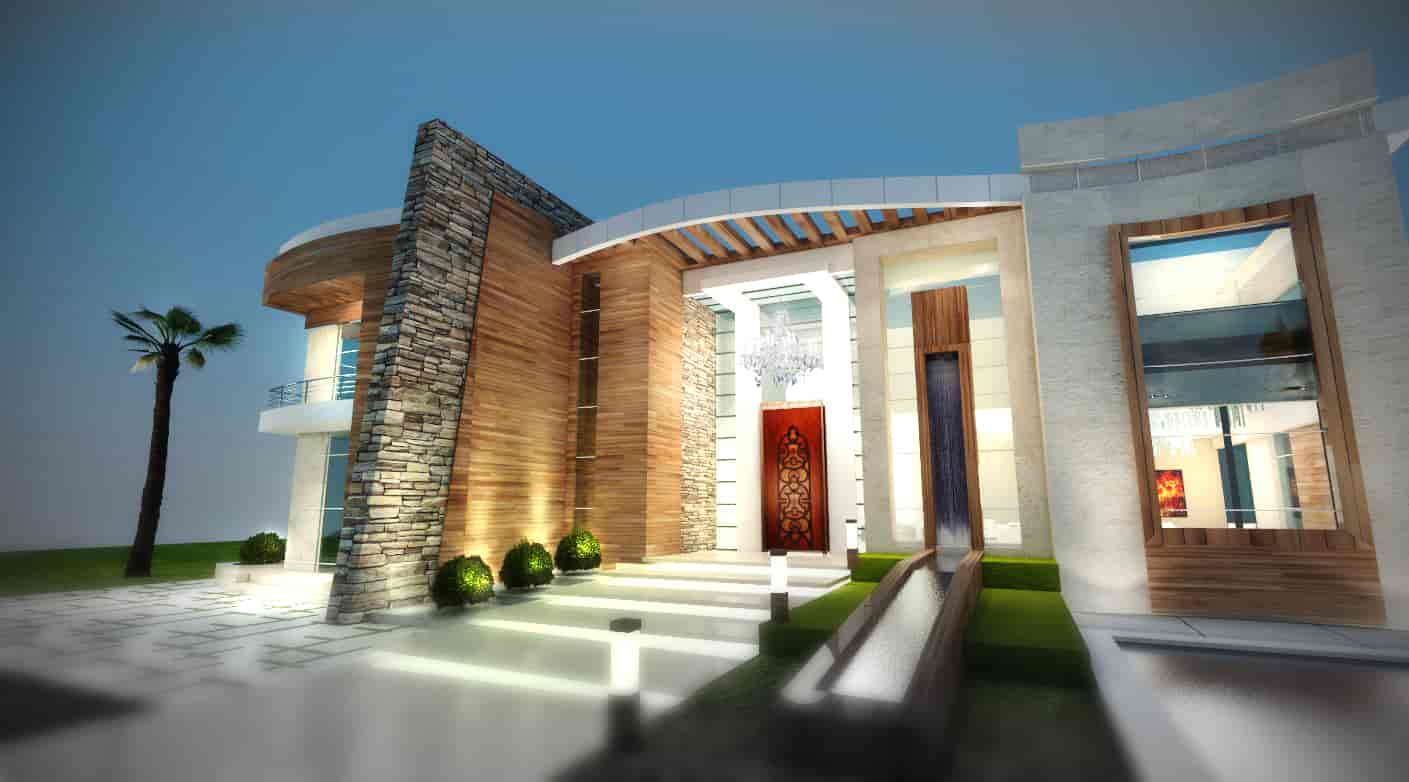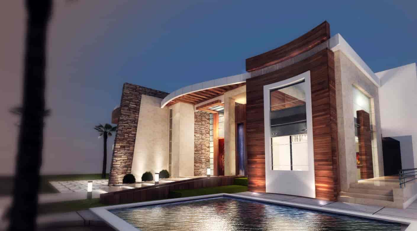 As you approach this exquisite villa, your gaze is drawn to a resplendent chandelier, illuminating the path to the front door. This touch of opulence sets the tone for the architectural marvel that lies beyond.