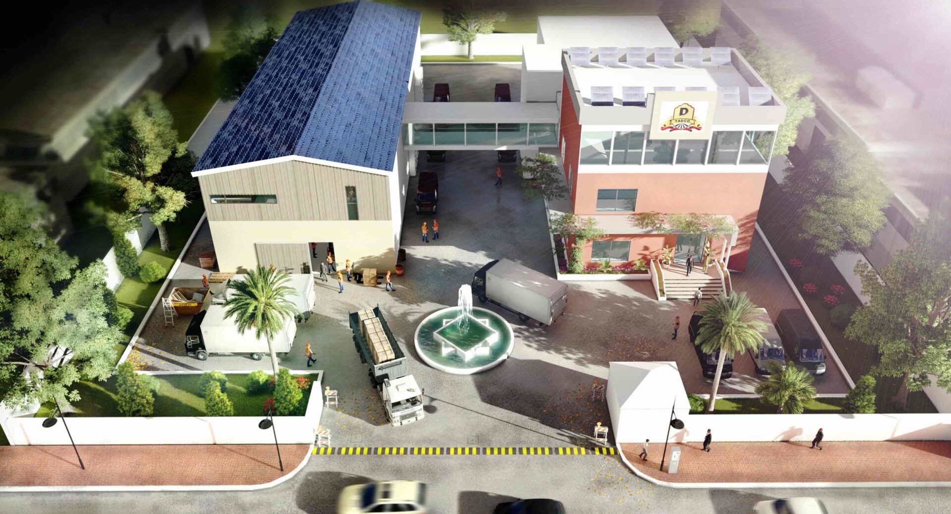 A striking feature of this factory is the suspended bridge that links the two buildings. This architectural marvel not only serves as a visual focal point but also represents the seamless flow of operations between distinct areas.