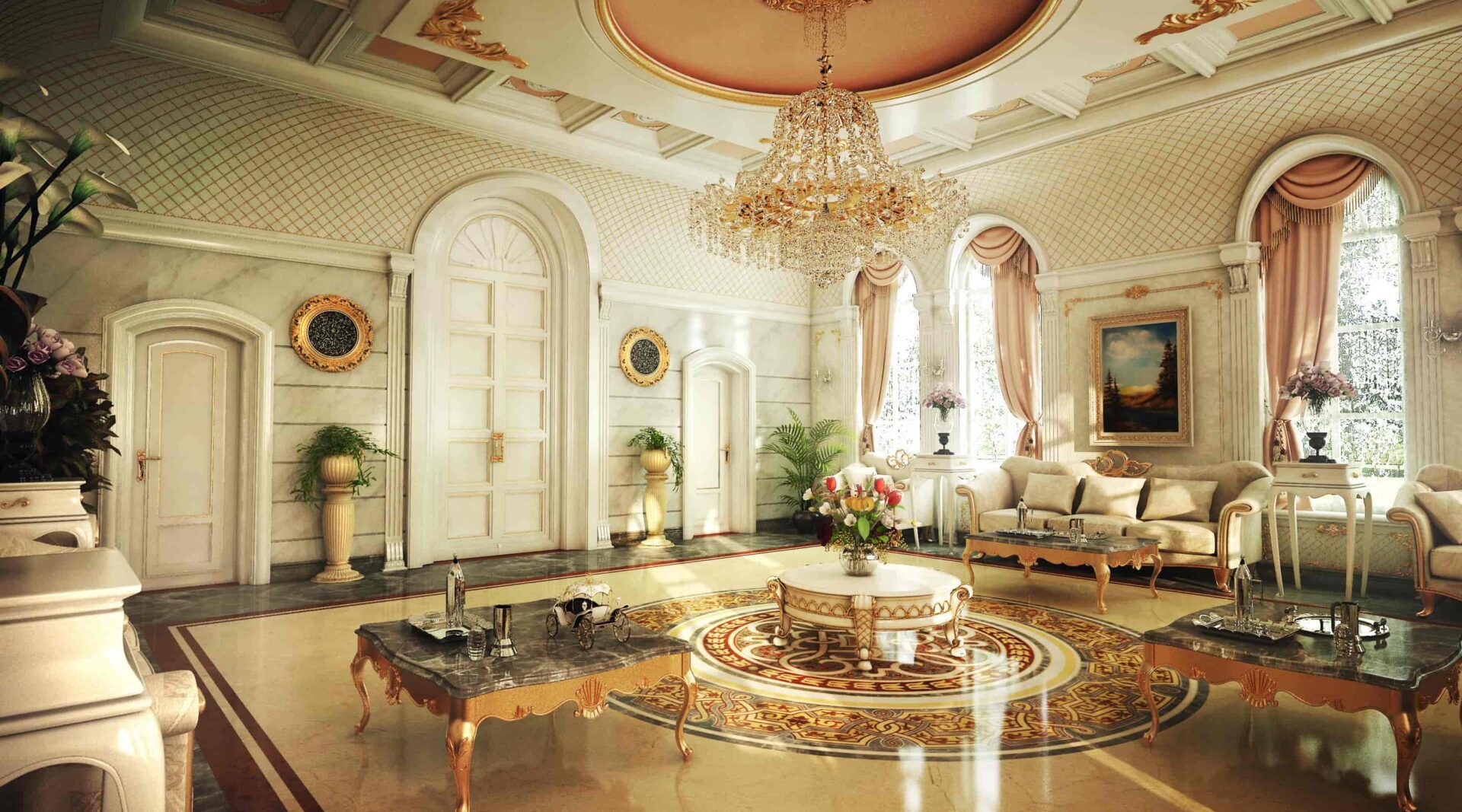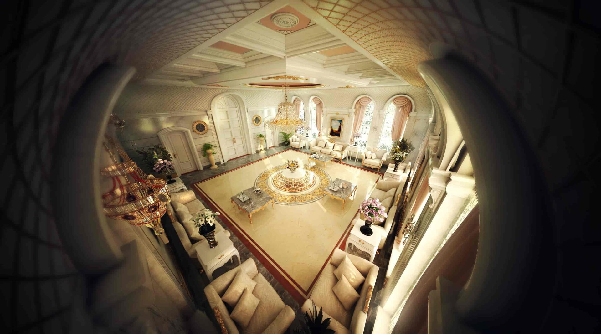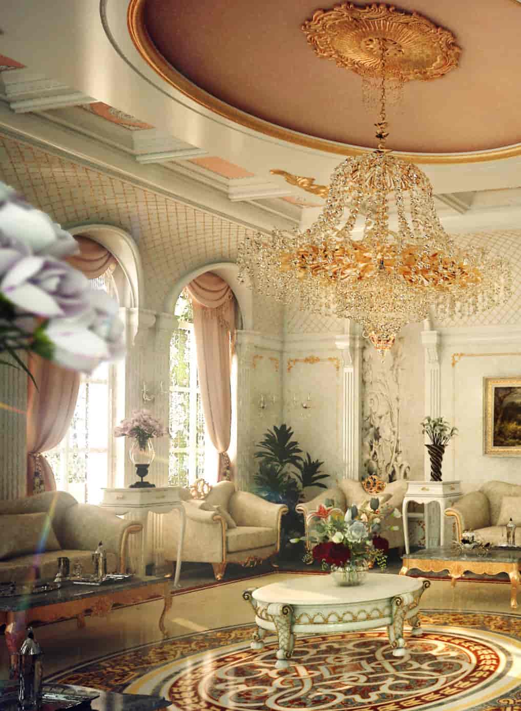 The living room's architecture mimics that of a palace, with high ceilings, detailed moulding, and elaborate cornices, elevating the space to new heights of luxury.
