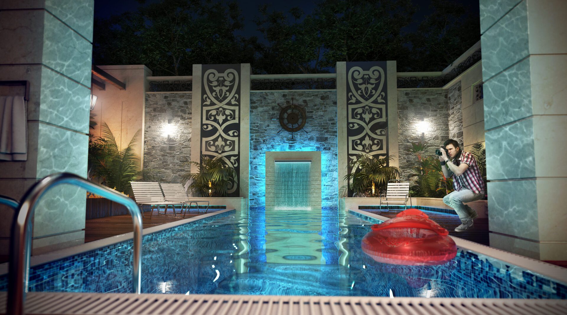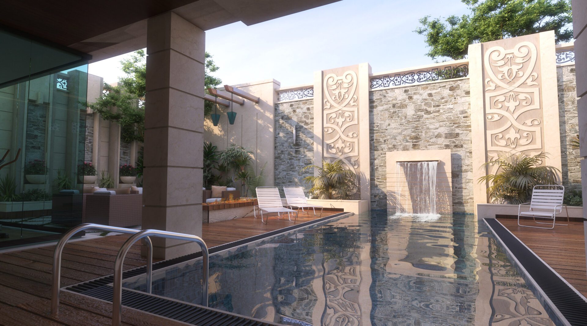 the breathtaking pool, beckons guests with its azure depths, glistening under the sun’s radiant caress. Gently curving in tandem with the villa’s contours, it offers an inviting oasis, seamlessly merging with the verdant landscape.