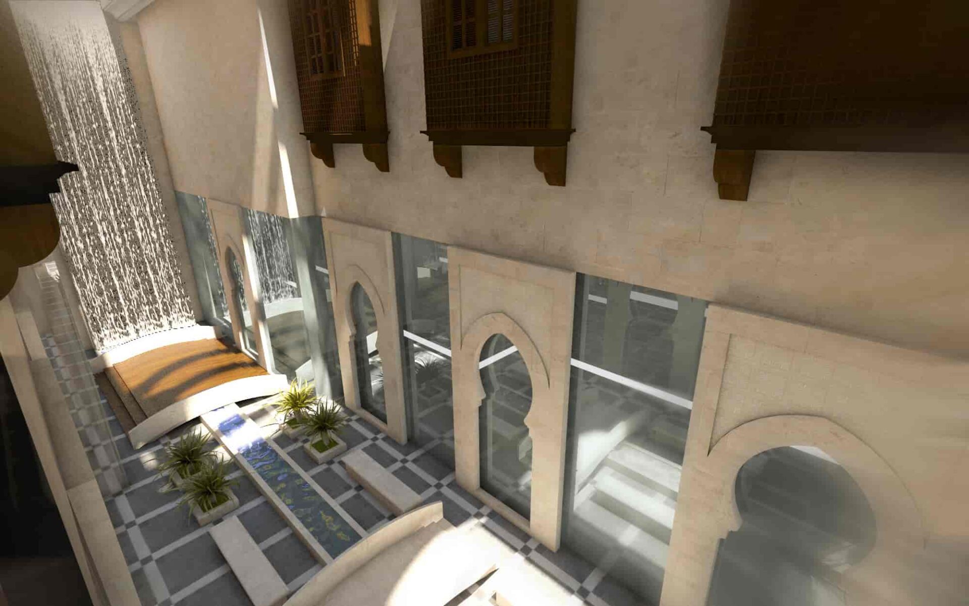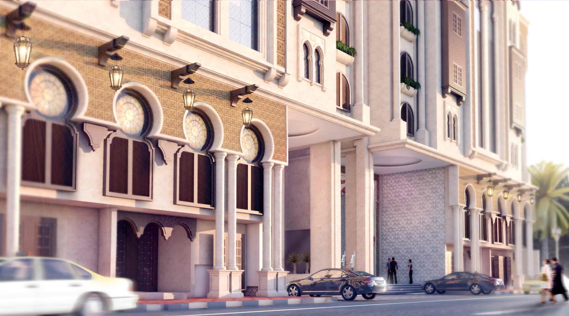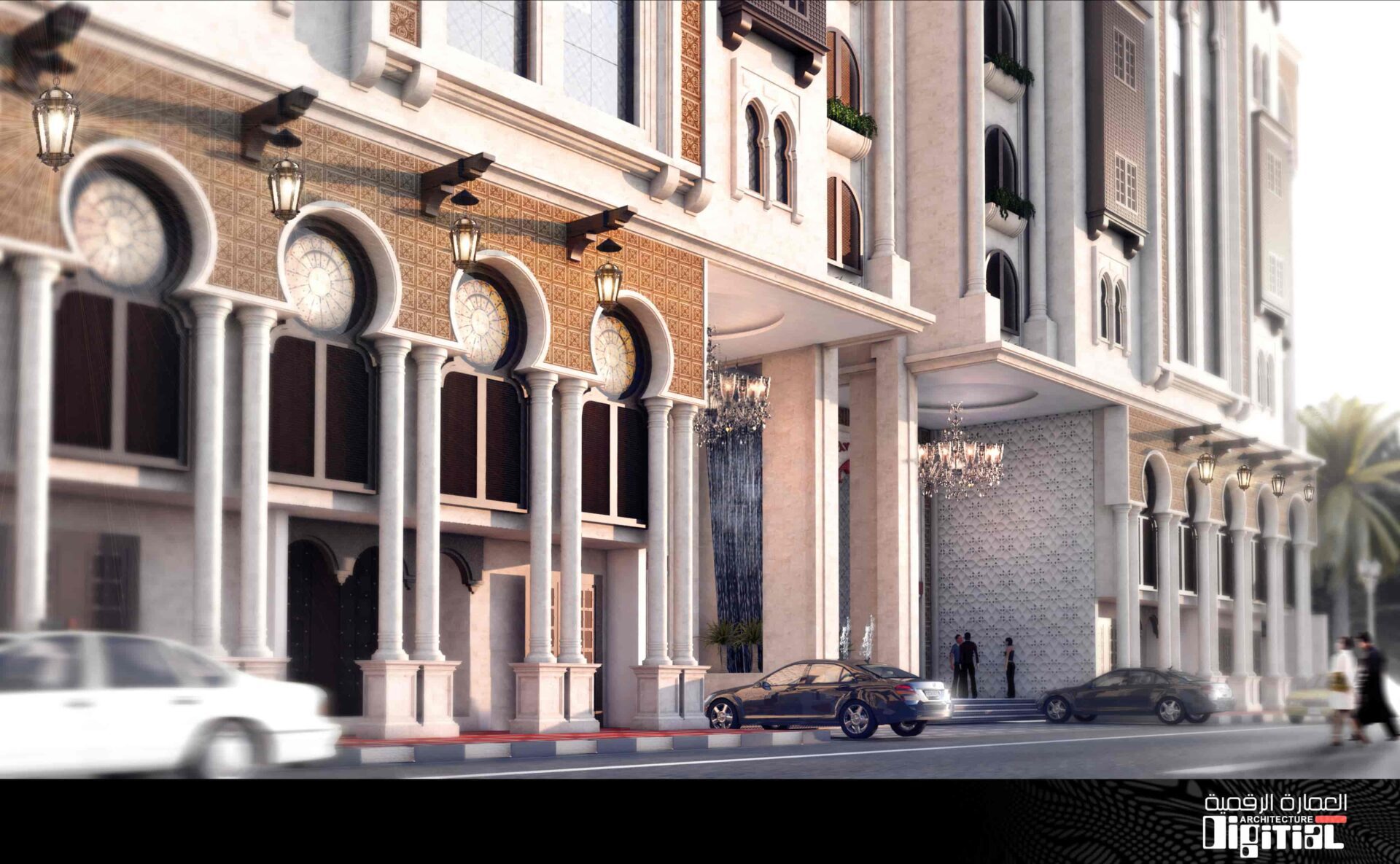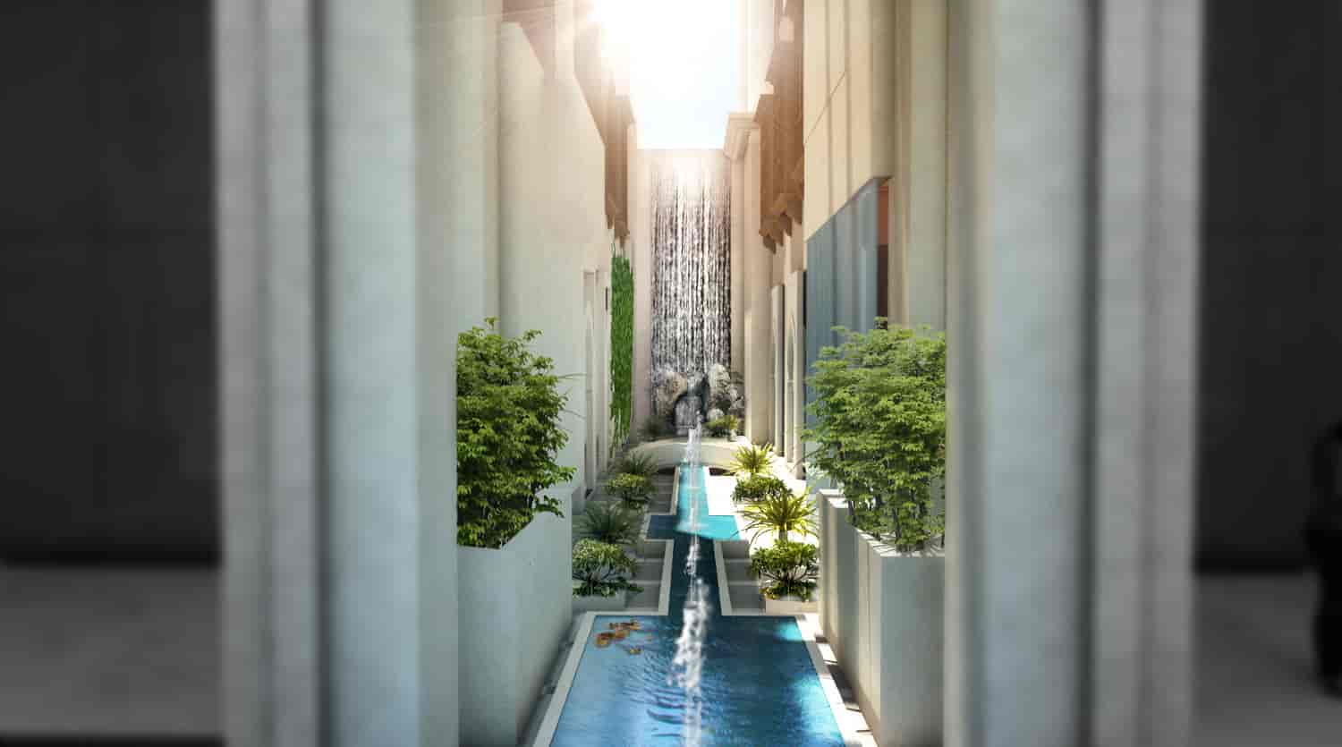 Stepping into the hotel, guests are greeted by an awe-inspiring reception area. The opulent chandelier, suspended at the entrance, sets the tone for the luxurious experience that awaits.